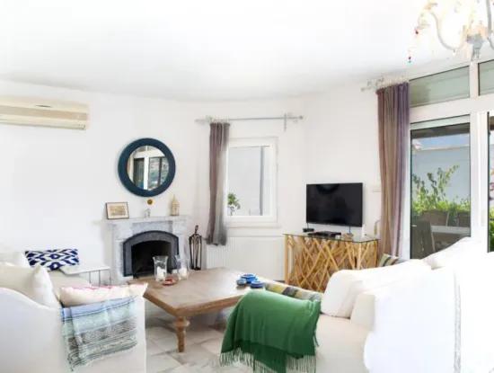 Our villa, located in the Yalıkavak Geriş area, is a semi-detached property in a twin villa style. It is situated within a gated community with a swimming pool and offers a panoramic sea view. The villa features a 3+1 layout, including a master bedroom with an en-suite bathroom, one additional bathroom with a toilet, and a separate toilet. It is equipped with a fireplace and air conditioning